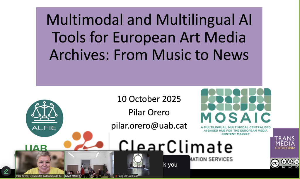 Pilar Orero, from the Universitat Autònoma de Barcelona and the TransMedia Catalonia research group, presented “Multimodal and Multilingual AI Tools for European Art Media Archives: From Music to News” at the Interweaving Languages: Multilingualism in Art and Education hybrid conference, held 9–11 October 2025 in Budapest.